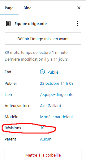 WordPress utilise un système historique appelé « révisions ». Utilisez le si vous souhaitez revenir vers une version précédente de la page (cf. image ci-dessous).