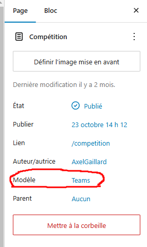 ⚠️ ATTENTION : Pour le bon fonctionnement du site, ne pas modifier le « Modèle » d’une page (cf. image ci-dessous).