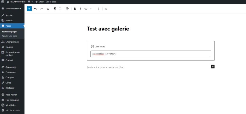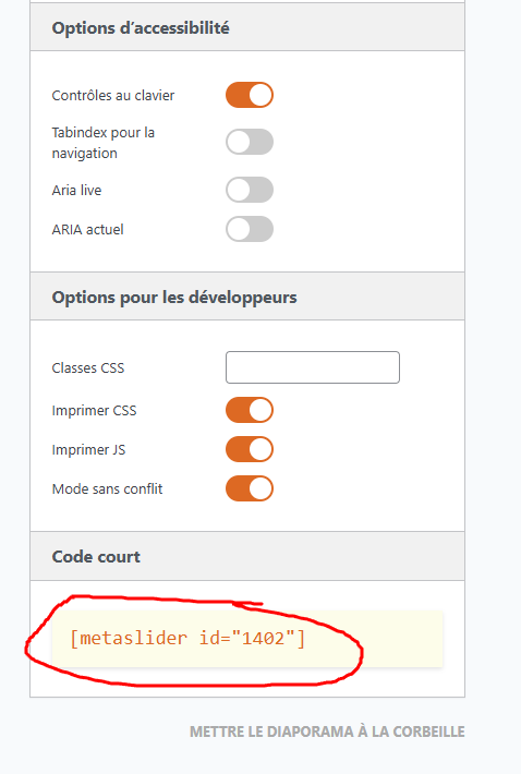- Il suffit ensuite de récupérer le « Code court » (cf. 3e image ci-dessous) du slider et de l’insérer directement dans la page (cf. 4e image ci-dessous)